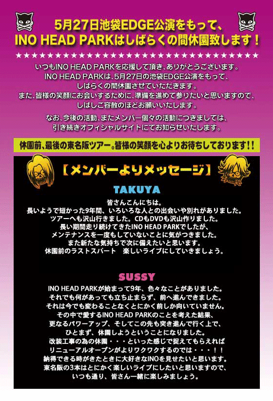 4月6日、本八幡ルート14公演にたくさんのクルーの皆様にご来園頂き、本当にありがとうございました。いつも通りのINO HEAD PARKでSORAの卒園を見送って上げることができ、メンバー、スタッフ共々、感謝の気持ちでいっぱいです。INO HEAD PARKは再びTAKUYA、SUSSYを中心にがんばっていきますので、引き続き応援を宜しくお願い致します。
